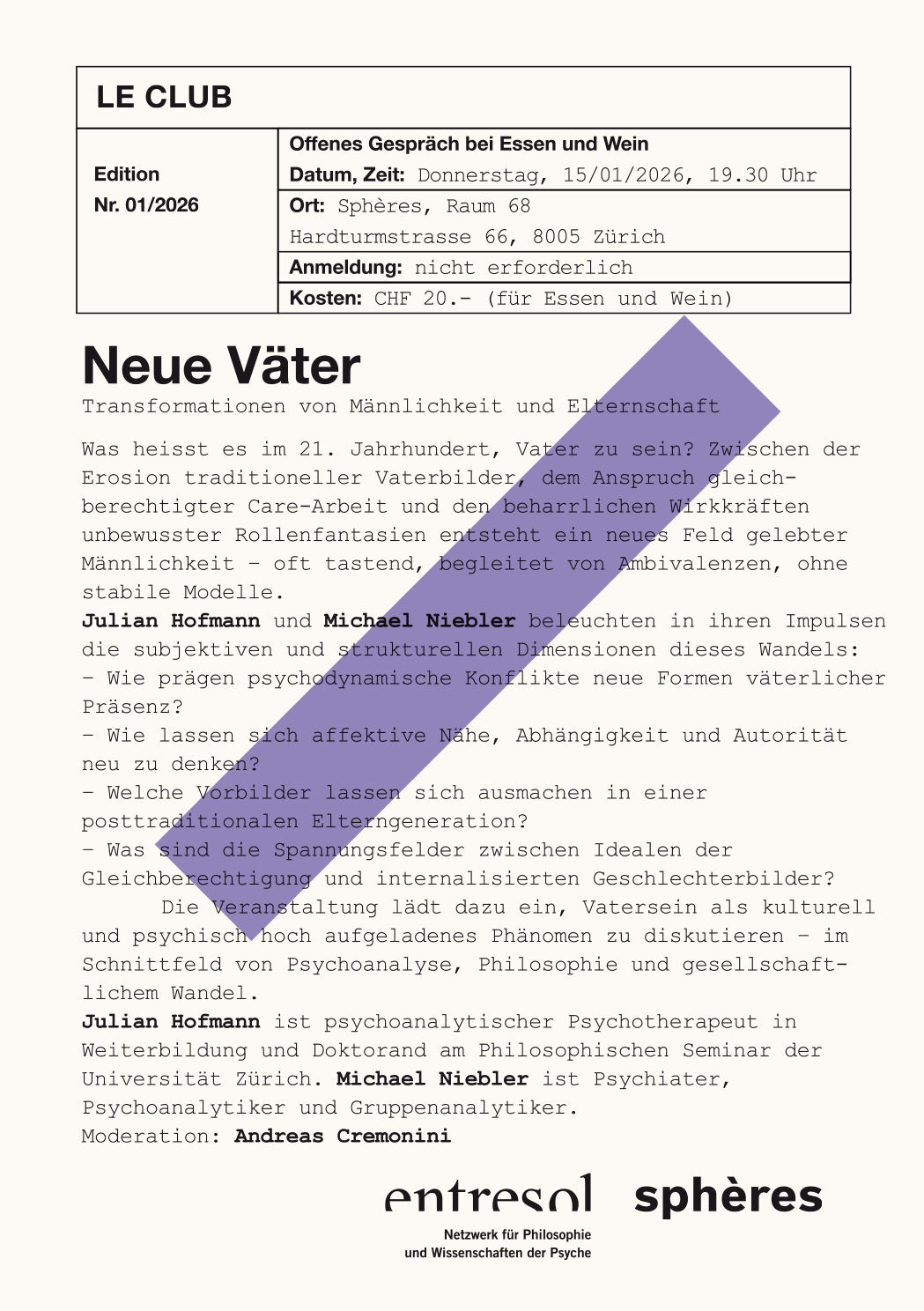 Die Veranstaltung lädt dazu ein, Vatersein als kulturell und psychisch hoch aufgeladenes Phänomen zu diskutieren – im Schnittfeld von Psychoanalyse, Philosophie und gesellschaftlichem Wandel.